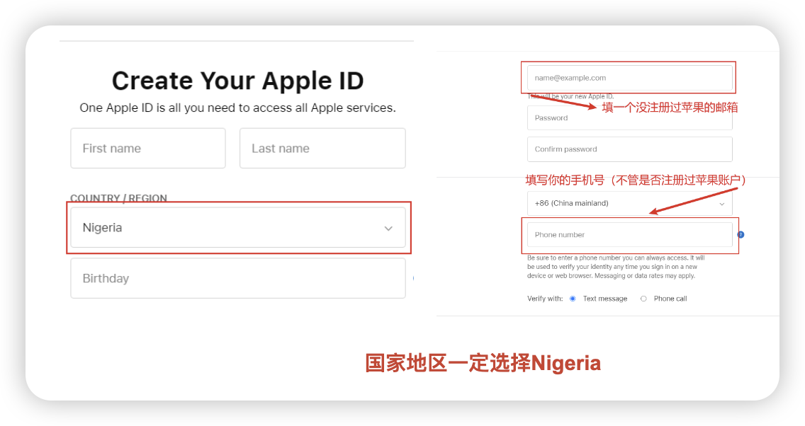 登录https://appleid.apple.com/account开始注册苹果账号,国家和地区一定选择Nigeria