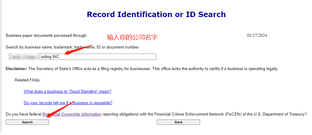 3. 在搜索框中输入你的公司的名字,然后点“search”,如图: